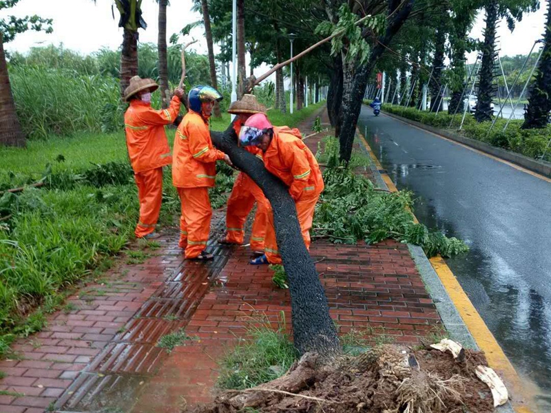 今年第9號(hào)臺(tái)風(fēng)“山神”的中心于今天凌晨4點(diǎn)50分前后,在海南萬(wàn)寧市萬(wàn)城鎮(zhèn)沿海登陸。受其影響,今天三亞、陵水有大到暴雨,將三亞、陵水街頭不少樹(shù)木刮倒,到處是殘枝敗葉,一片狼藉。臺(tái)風(fēng)中,為了確保市容環(huán)境的整潔、干凈,集團(tuán)公司安排環(huán)衛(wèi)工人全員上崗,加緊清理街道路面,使城市迅速恢復(fù)潔凈。