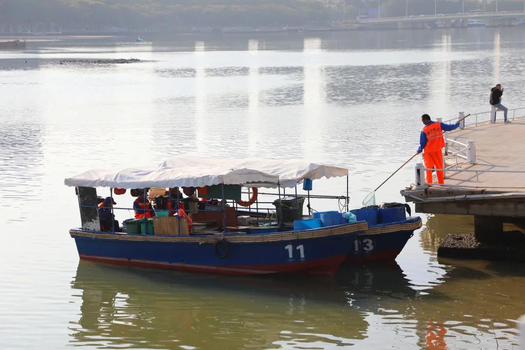 曾靈是三亞明佳園林環(huán)衛(wèi)集團(tuán)天涯區(qū)環(huán)衛(wèi)二隊(duì)的一名員工,和我們平常在街邊看到清理地面垃圾的環(huán)衛(wèi)工人有所不同,他的工作是在船上完成的,每天需要站在作業(yè)船上,手持一把長(zhǎng)柄濾網(wǎng),將漂浮在三亞河上的落葉、紙屑等垃圾打撈起來(lái),放入專(zhuān)門(mén)的垃圾桶里再運(yùn)輸走。記者來(lái)到曾靈的工作地點(diǎn):三亞河,近距離了解他春節(jié)期間的工作是什么樣的……