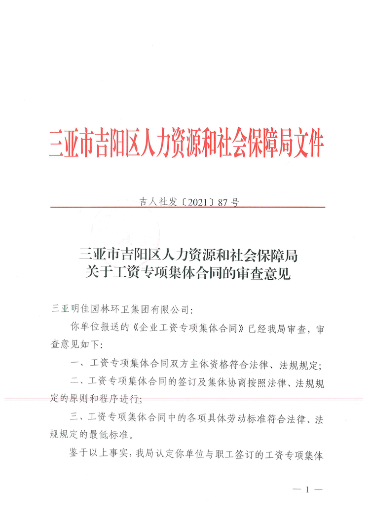 2021年8月2日,吉陽(yáng)區(qū)人社局審查通過我公司《企業(yè)工資專項(xiàng)集體合同》。8月4日?qǐng)?bào)三亞市總工會(huì)基層工作部備案。至此,三亞明佳園林環(huán)衛(wèi)集團(tuán)有限公司2021年度企業(yè)工資集體協(xié)商工作圓滿結(jié)束。
