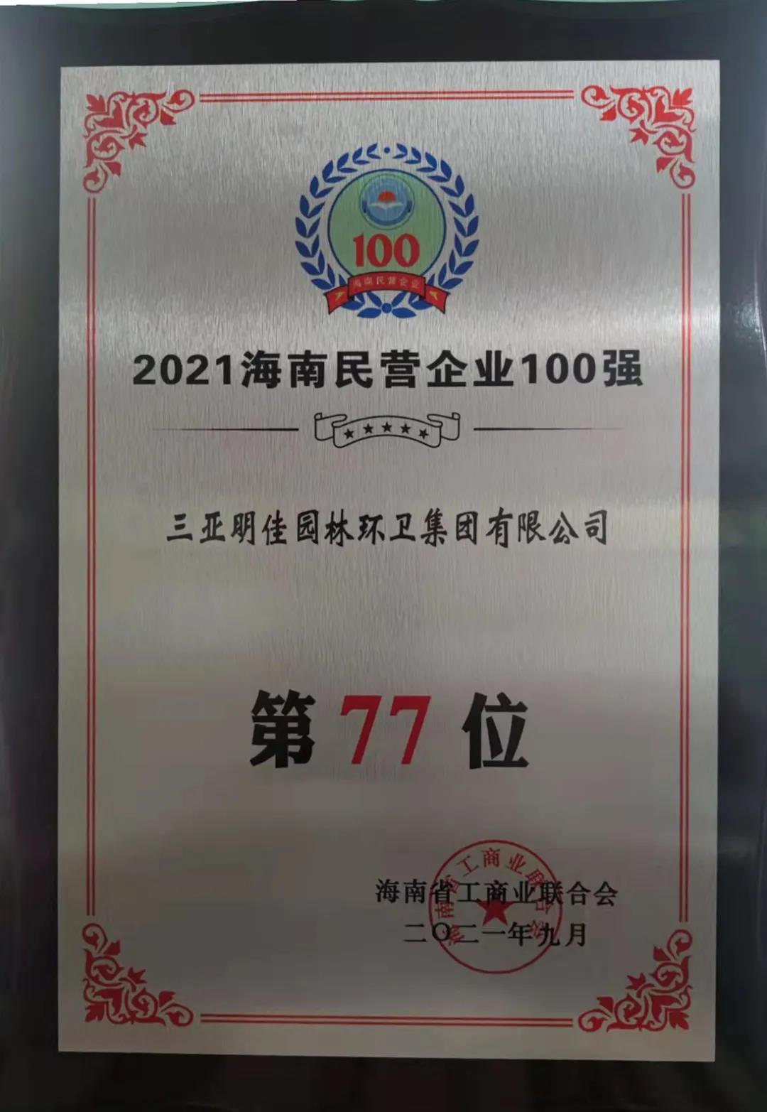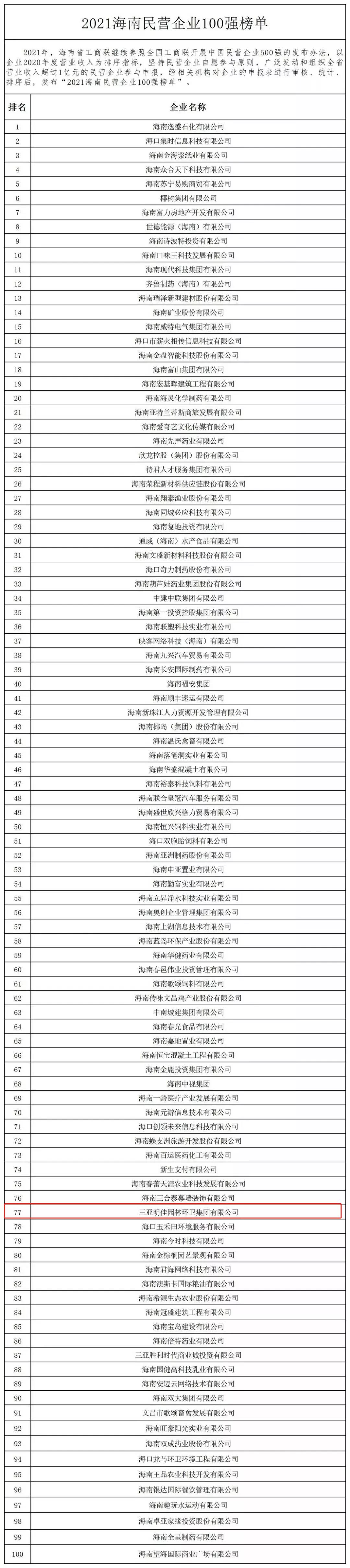 11月4日,海南省工商業(yè)聯(lián)合會在海口發(fā)布“2021海南民營企業(yè)100強(qiáng)”榜單。三亞明佳園林環(huán)衛(wèi)集團(tuán)有限公司2019至2021年連續(xù)三年入選海南民營企業(yè)100強(qiáng)。