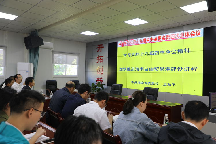 12月7日上午10:00時(shí),一場主題為“學(xué)習(xí)貫徹黨的十九屆四中全會(huì)精神,推進(jìn)海南自貿(mào)區(qū)(港)治理現(xiàn)代化”專題輔導(dǎo),在明佳集團(tuán)辦公大樓三樓多功能會(huì)議廳舉辦。此次專題輔導(dǎo)報(bào)告是明佳集團(tuán)黨支部為了落實(shí)上級(jí)指示,學(xué)習(xí)宣傳貫徹黨的十九屆四中全會(huì)精神,以及省委書記劉賜貴宣講黨的十九屆四中會(huì)全精神時(shí)提出的要求,組織黨員干部集中學(xué)習(xí),確保將黨的十九屆四中全會(huì)精神傳達(dá)至每一名黨員及一線員工。